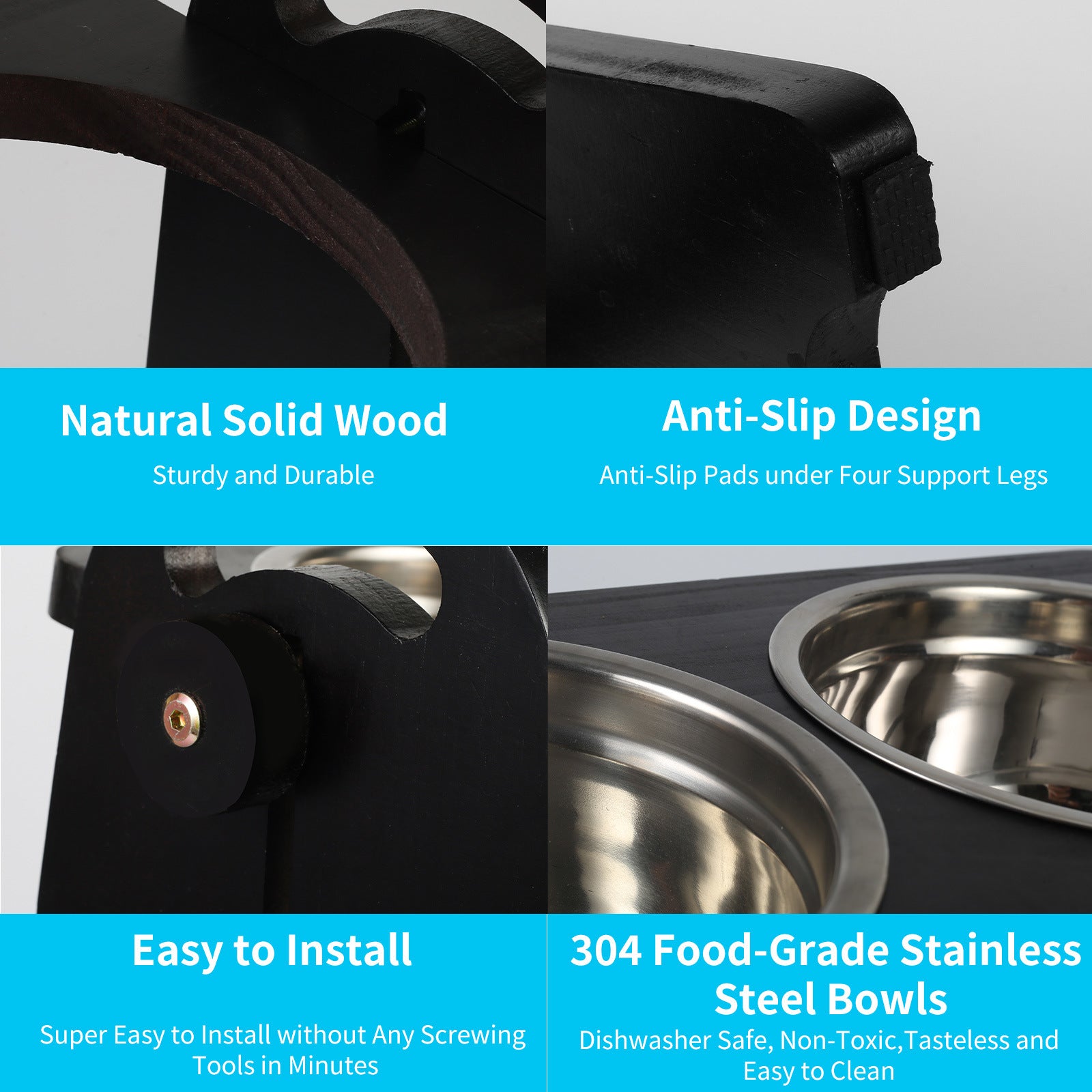Double Stainless Steel Food and Water Bowls Can be Taken out From Stand at any time for Easily Cleaning and Dishwasher Safe, The Solid Wood Surface won’t get Mouldy Even if It gets Wet by Food or Water.