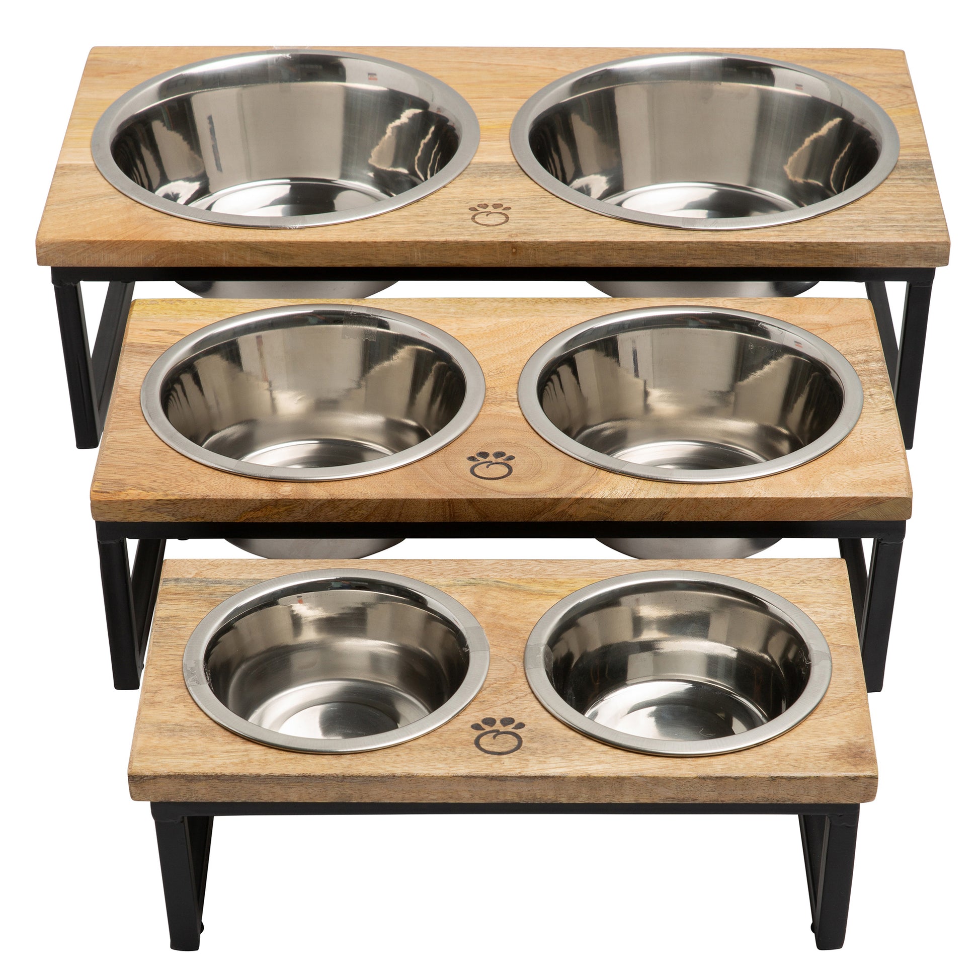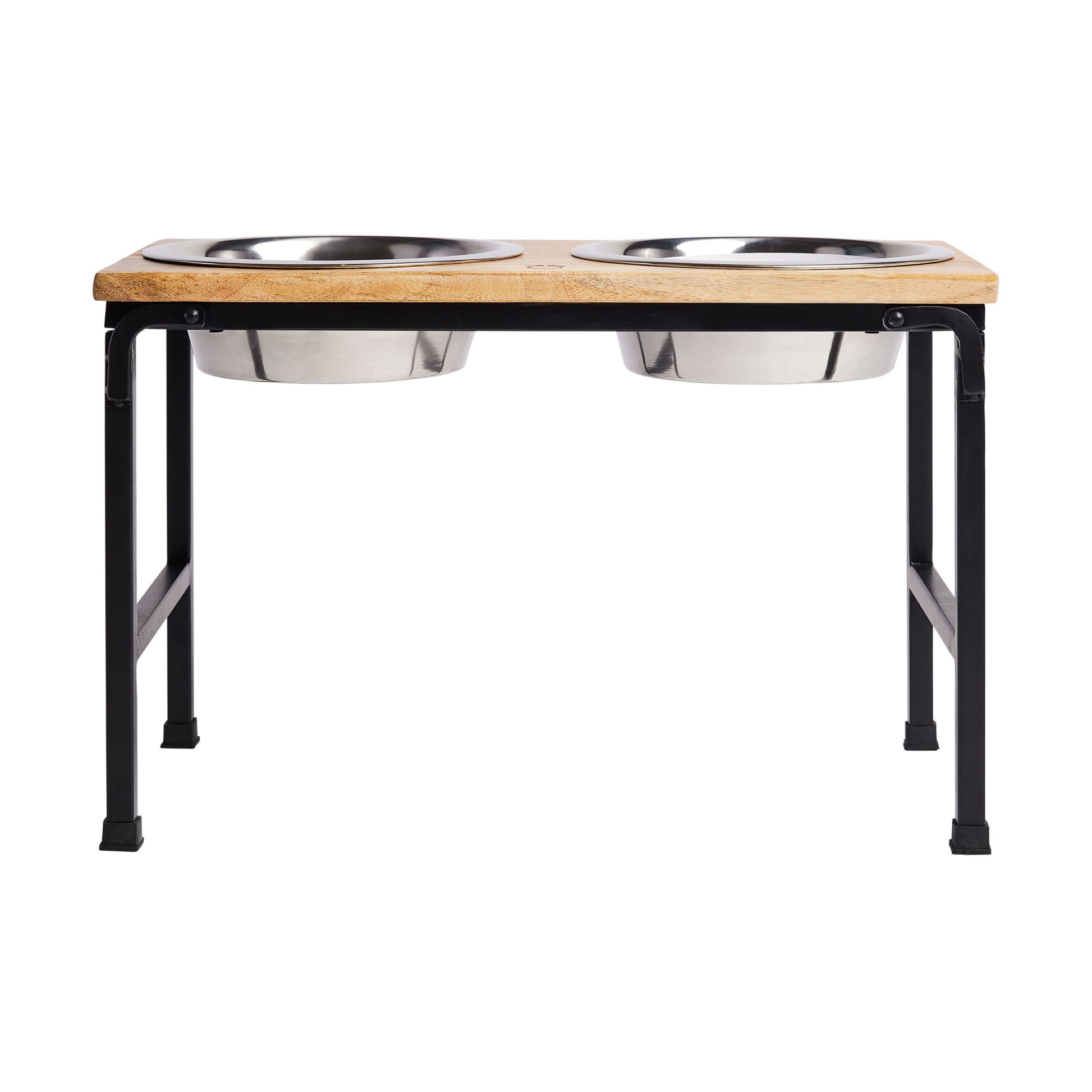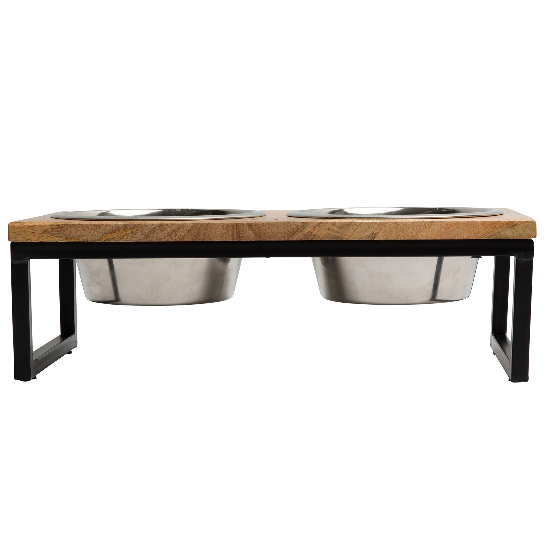 Mango Wood Double Feeder with an elevated metal base to provide a comfortable and ergonomic feeding experience for your pet.